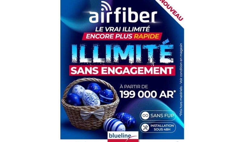Manamafy ny fanavaozana ataony eo amin’ny sehatry ny tolotra internet illimité na tsy voafetra ny orinasa Blueline, amin’ny fanolorana ny Airfiber amin’ny endrika “sans engagement”na azo jifaina tsy voafatotry ny fifanarahana maharitra. Safidy vaovao izay manome fahalalahana bebe kokoa ny mpanjifa, nefa mitovy amin’ny tolotra misy “engagement”.